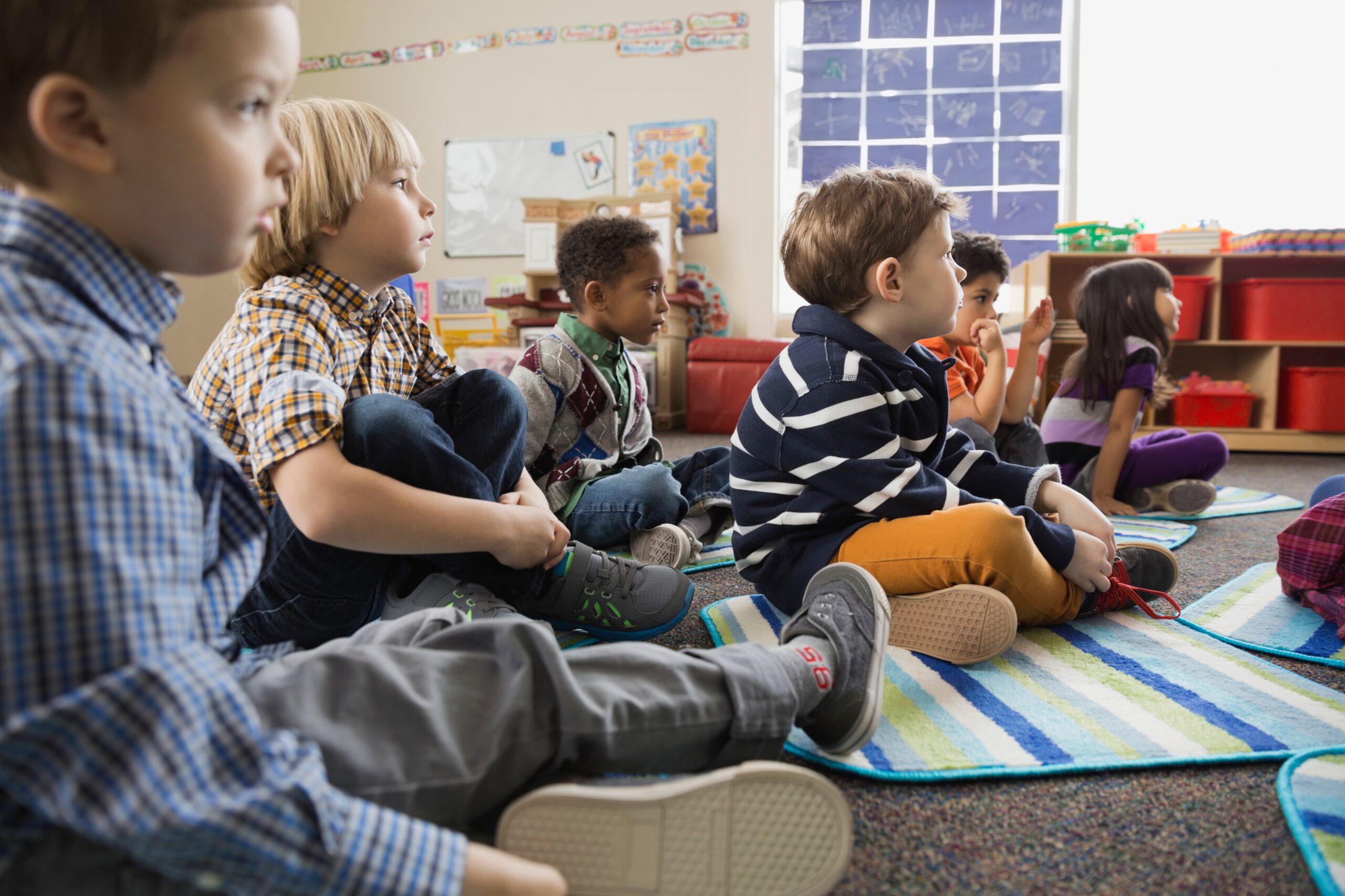 A group of small nursery school children sitting on floor indoors in classroom.
